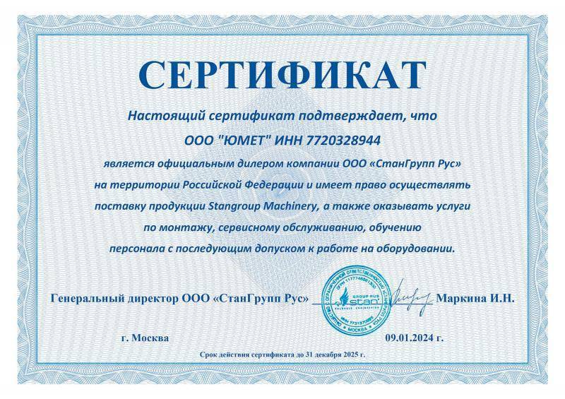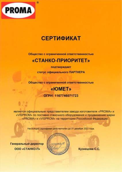 Компания Юмет является официальным дилером и имеет сертификаты более, чем 20 проверенных и надежных поставщиков, таких как Stalex, MetalTec, Proma, Metal Master, TOR, Vektor, Grost, Мобипроф, Сатурн и другие. Наш ассортимент включает в себя станки для металла и дерева; строительное оборудование; станки для производства профилей; оборудование для плазменной и лазерной резки.